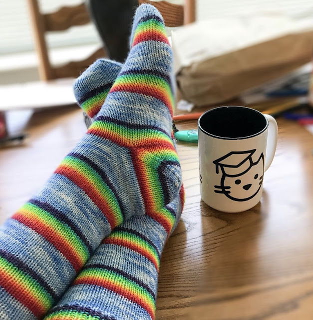 - Although I love the fact that you can insert the heel anywhere on these socks, I wish I had planned ahead a bit so that it would have been inserted in the middle of a blue section, or at least in the center of a rainbow section, or at least I should have bumped it up so it started at the bottom of a blue stripe instead of at the very top of the rainbow stripe. They still look nice, though!
